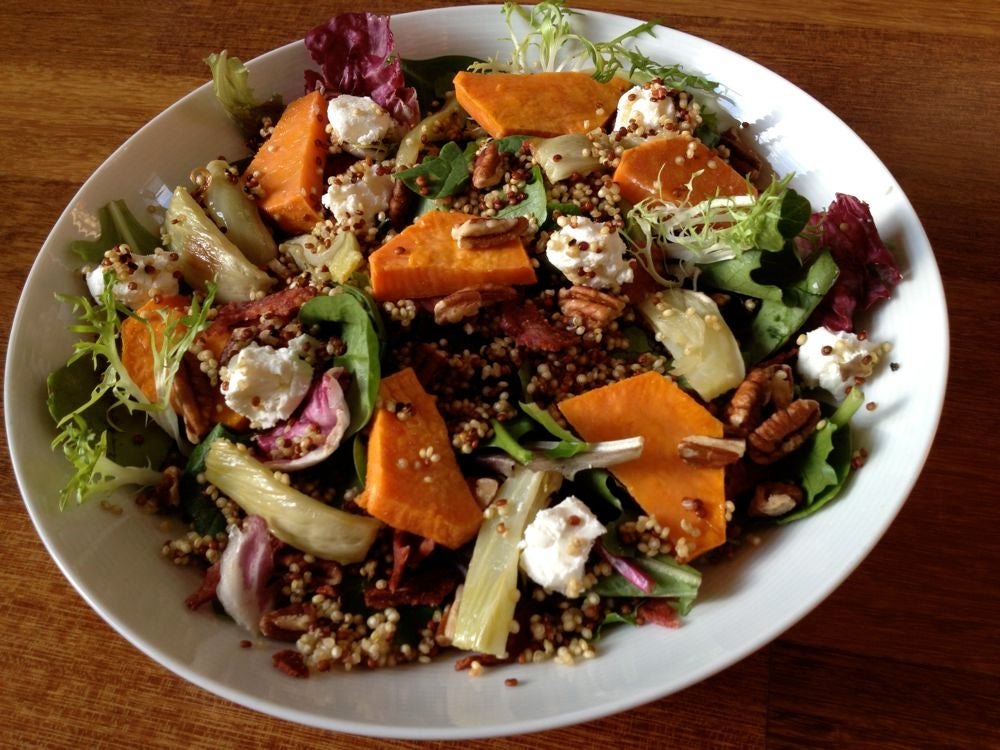 All the nutrition you need in a meal can be found in this salad. The turkey bacon adds a nice smokiness and brings a touch of protein along with the nutty quinoa. A healthy dabble of fat comes from the crunchy pecans and the creamy goat cheese, while the yams provide a hearty carbohydrate with a surprising warm and toasty flavor from roasting them in cumin. Tossed with roasted fennel and spring mix, this salad makes for a fresh and satisfying meal.
