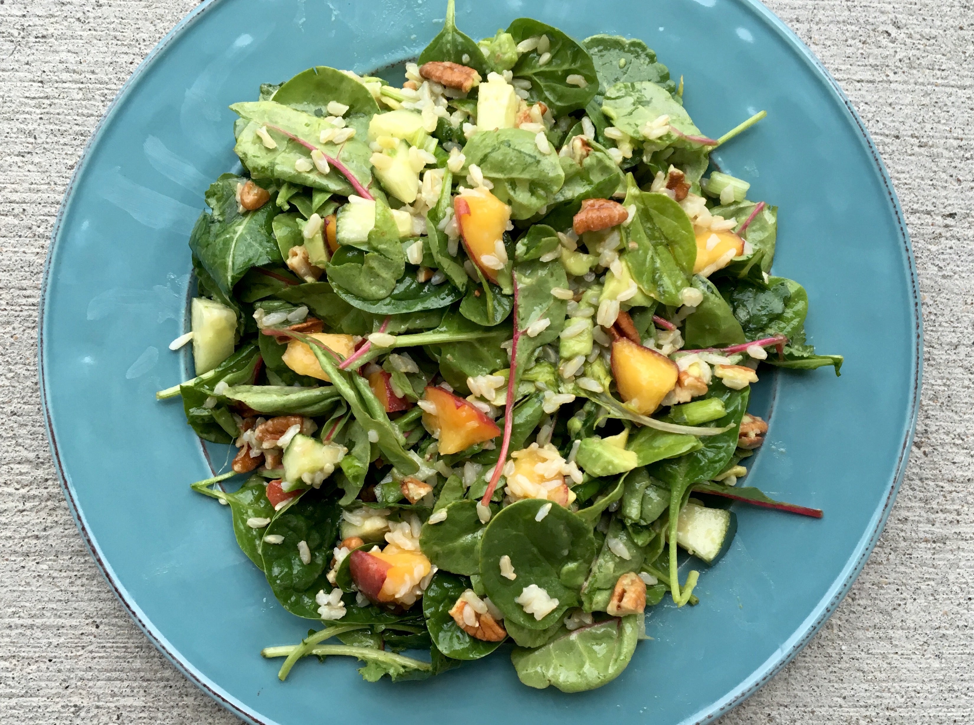 2. Add the greens to a large bowl. Gently toss in the peaches, avocado cucumber, celery, pecans, and green onions.