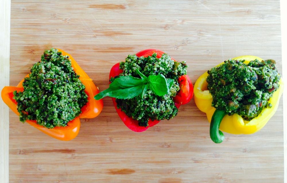 These peppers are packed with protein, fiber and offer a rich dose of vitamins. They are easy to make ahead of time and great for leftovers. Plus, the pesto recipe is cheese and nut free and provides a secret substitute for the traditional loads of olive oil. Get creative by adding in chopped veggies or beans and topping with Parmesan or feta cheese.