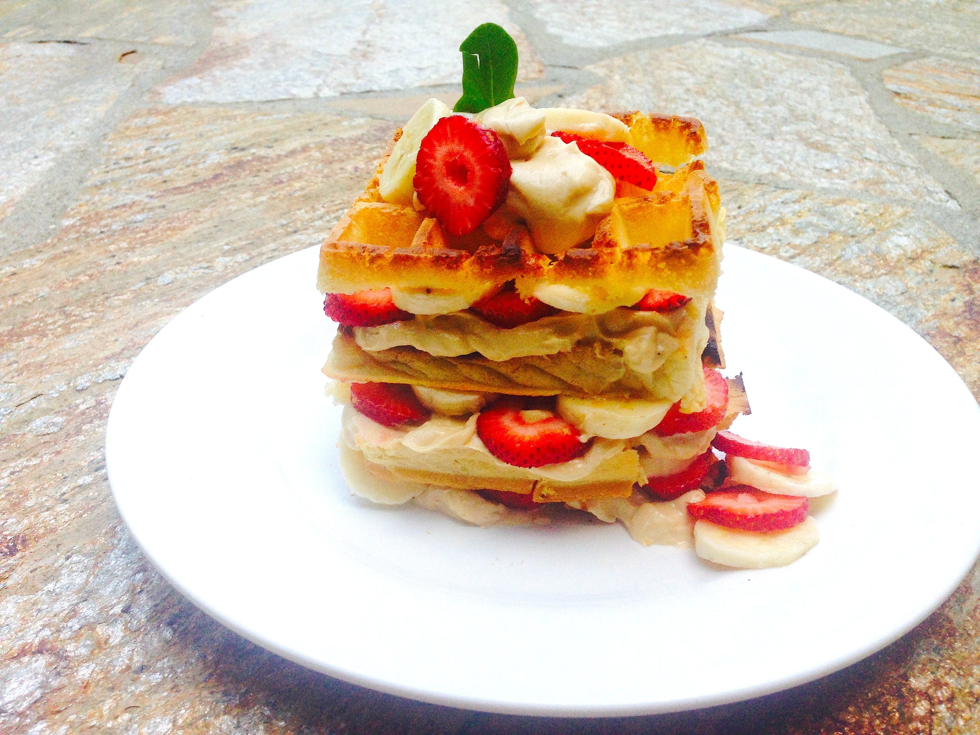 Here’s a creative way to use toaster waffles to get in some serious fuel before a long training session. The almond butter cream is the star, and can be used in some many other breakfast recipes or snacks. This waffle stack also doubles as an impressive dessert.