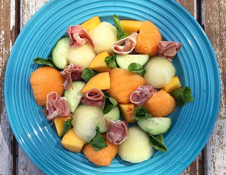 The final days of summer are near, but summer fruits are still lusciously ripe. Try this juicy, sweet melon and peach salad, counterbalanced with salty prosciutto and crisp basil. Use this side dish to add a little nutrition to that Labor Day barbecue!