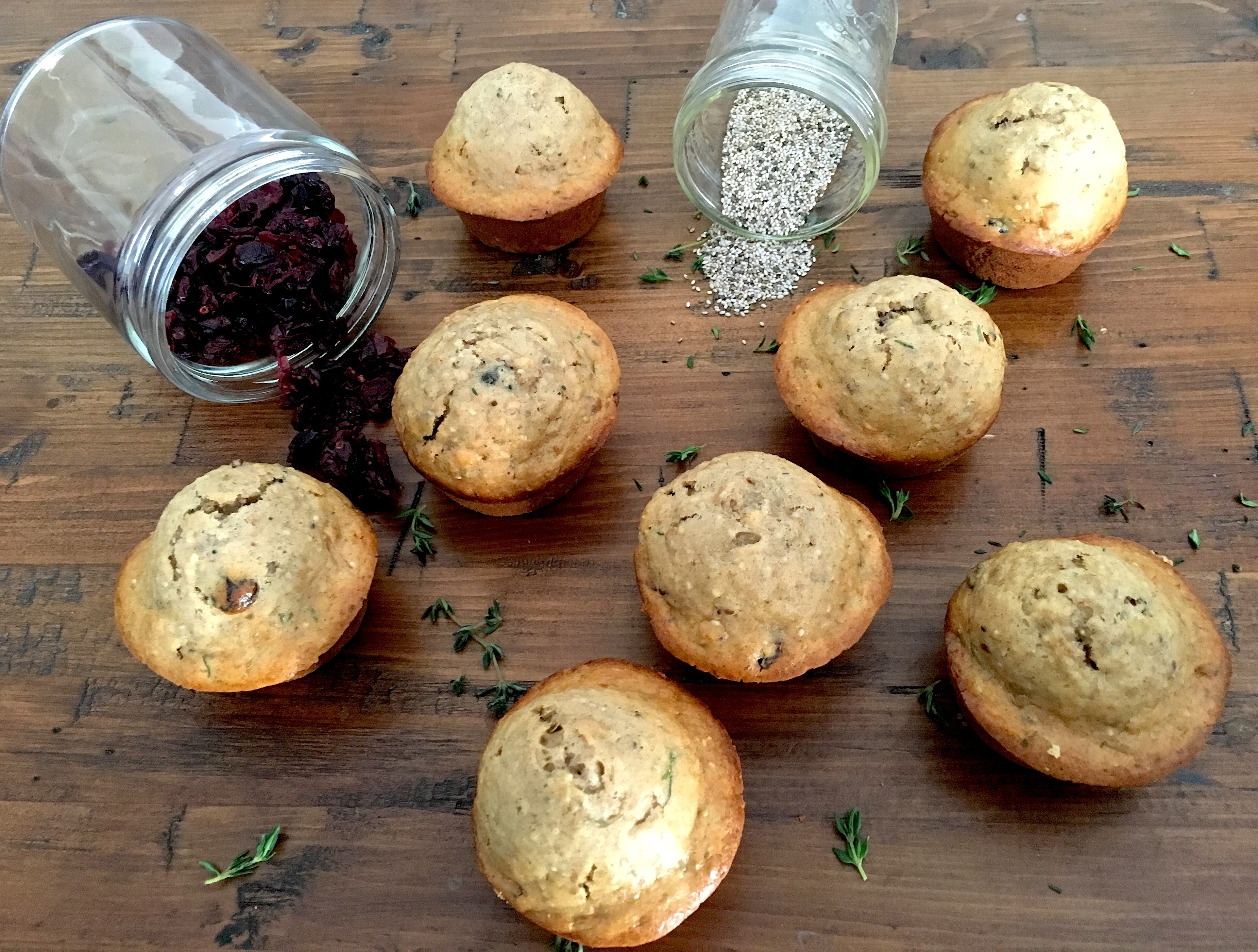 Fresh thyme, dried cranberries, chia seeds, pecans and Nutri-Grain cereal come together in a delicious balance of flavors and texture in these curious little muffins. The standout ingredient is fresh thyme, creating an earthy complement to the standard sweetness of a muffin. Filled with whole grains and fiber, these muffins are sure to keep you full when paired with Greek yogurt or eggs at breakfast, or served warm along side a hearty bowl of soup at lunch or dinner.