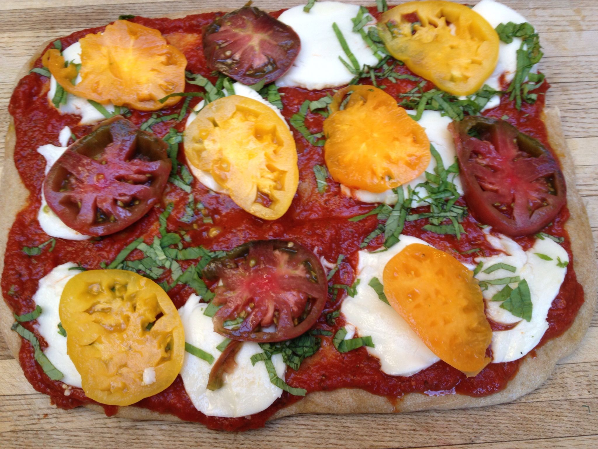 Pizza and salad unite into one harmonious dish. First, roasted garlic and creamy fresh mozzarella are baked to bubbling perfection. Then heirloom tomatoes, which are juicy and colorful right now, and an arugula and fresh basil salad round out the topping to this crave-worthy pizza.