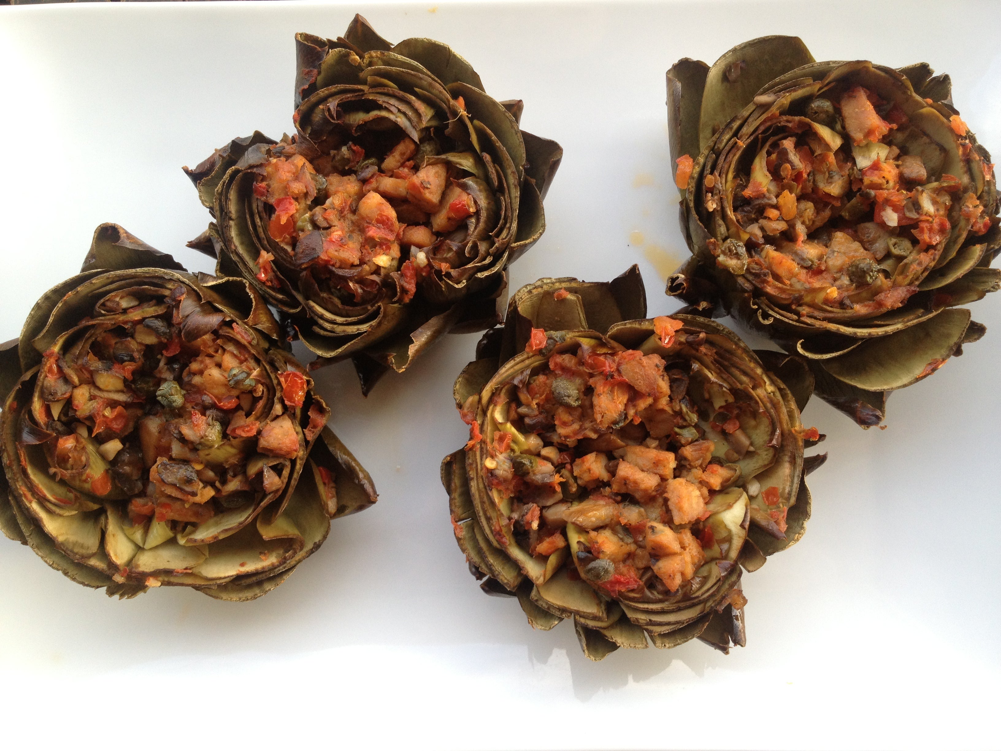 3. To prepare the filling: Heat the oil in a sauté pan over medium heat. Dice the chicken sausage and mushrooms very finely. Add to the pan and sauté about 6-8 minutes, until the chicken sausage and mushrooms are slightly browned. In a bowl, combine the chicken sausage and mushrooms with the prepared bruschetta topping and capers. Evenly divide the filling into the opened center of each artichoke. Use any excess topping to fill into the spaces between the leaves of the artichokes.