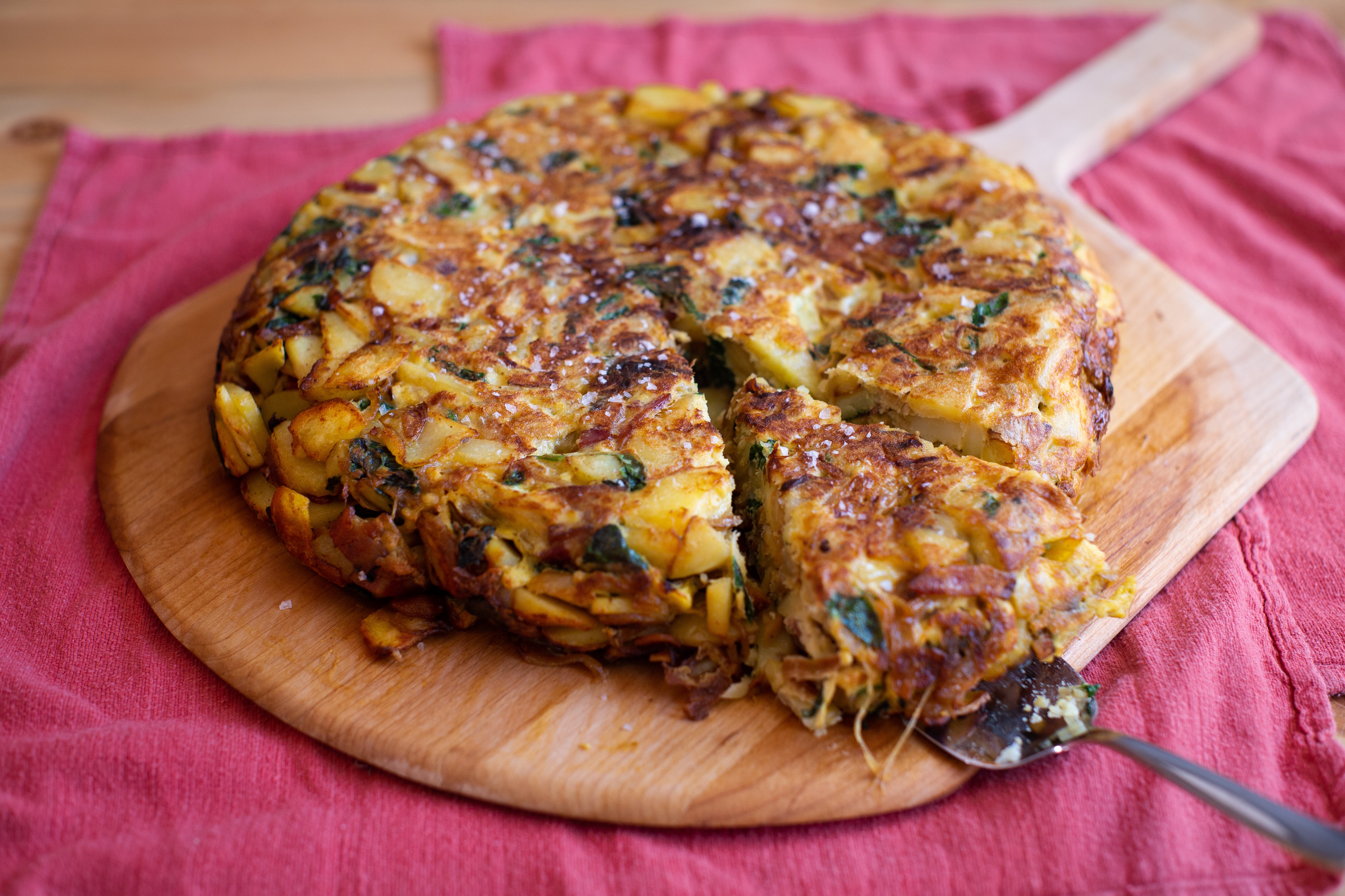 Tortilla de Patatas is one of the simplest, yet nutritious anytime meals endurance athletes can make. At its core, it’s just potatoes, eggs, olive oil, and salt and pepper, and it’ll give you a great mix of carbs, protein, and fat that your body needs to spend hours on the course. Or, you can take it to the next level—as I like to do—with ingredients like caramelized onion, sautéed spinach, and chopped bacon.