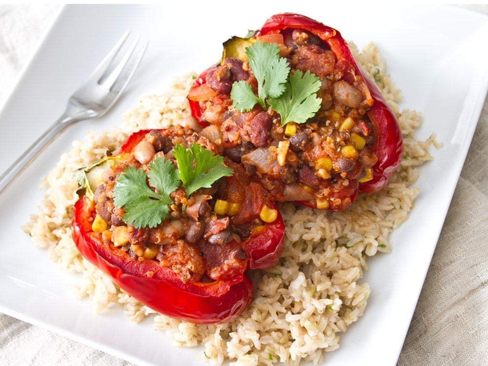 While chili is simmering, lightly oil a foil-lined baking sheet and place halved bell peppers cut side down. Bake in oven for 10–15 minutes or until lightly roasted. Remove peppers from oven, and divide chili evenly among them. Serve over basmati rice. Garnish with cilantro. Serves 4.
