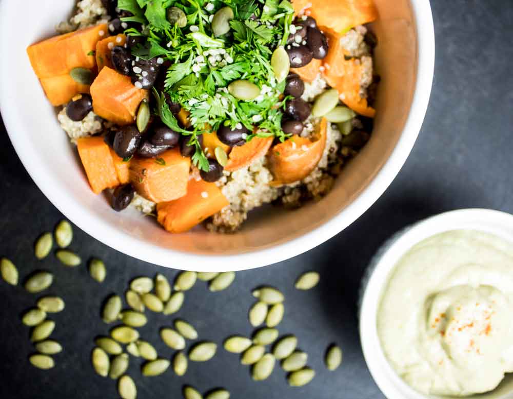 Wash and poke sweet potatoes several times with a fork. Bake potatoes for 30-40 minutes, depending on size, until fork tender. In a medium saucepan, bring 2 cups of water to a boil. Add the quinoa, stir to combine, cover, and let cook for 13-15 minutes. Fluff quinoa with a fork, and set aside. Heat beans on stove in their liquid over medium heat until they start to bubble. Reduce heat to low while the sweet potatoes finish cooking. Prepare your cilantro. Once potatoes are cooked and cool enough to handle, chop them into small cubes. Assemble your bowl: Layer items any way you like.