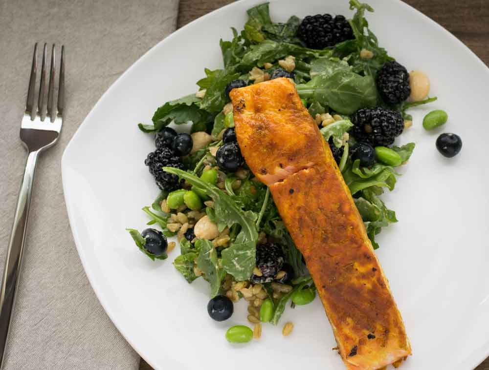 Chef’s choice: “This meal was created to eat for dinner after a longish workout,” Holmquist says. “I put this together because of the protein in the salmon and farro, as well as the anti-inflammatory components of ginger, turmeric, berries, and greens. I like to focus on natural anti-inflammatory foods, as I have knee issues. It’s a light summer dish that is very easy to make.”