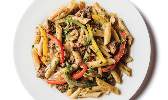 Fill a large stockpot with water and bring to a boil. Once pasta water reaches a boil, add the brown rice pasta and stir. (Stir frequently to prevent sticking.) In a large skillet over medi- um heat, cook the turkey sausage, breaking apart with a wooden spoon. Cook until browned, approximately 10–12 minutes. Re- move from the skillet onto a plate lined with paper towels to absorb excess oil. Heat olive oil in the same skillet over medium heat. Sauté onion, salt and pepper for 3 minutes. Add the peppers and sauté another 3 minutes, adding in garlic for the last minute. Turn heat to medium-high and pour in balsamic vinegar. Let reduce with the peppers and onions for 5 minutes. Add turkey sausage back to the skillet. Once the pasta has finished cooking, reserve 1⁄4 cup pasta water and then drain the pasta. Time this so you can immediately add the pasta to the pan with the onions and peppers. Toss the pasta and reserved 1⁄4 cup water in the skillet until thoroughly coated with sauce. Toss with fresh cilantro and store in four containers.