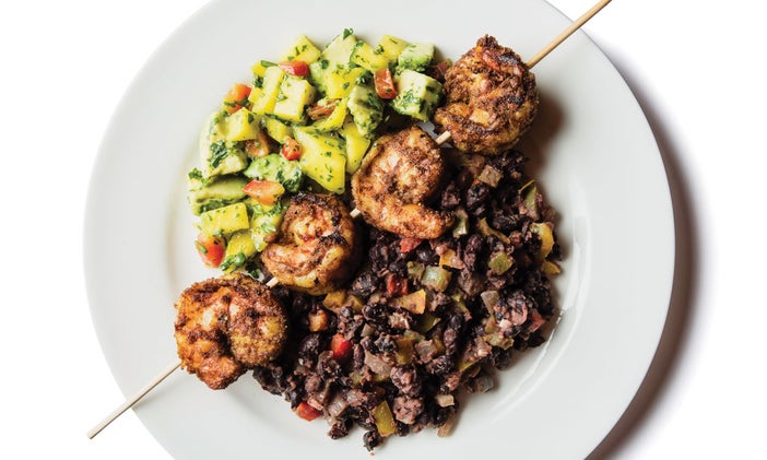Cumin-Crusted Shrimp Skewers with Mango-Avocado Salsa and Stewed Black Beans