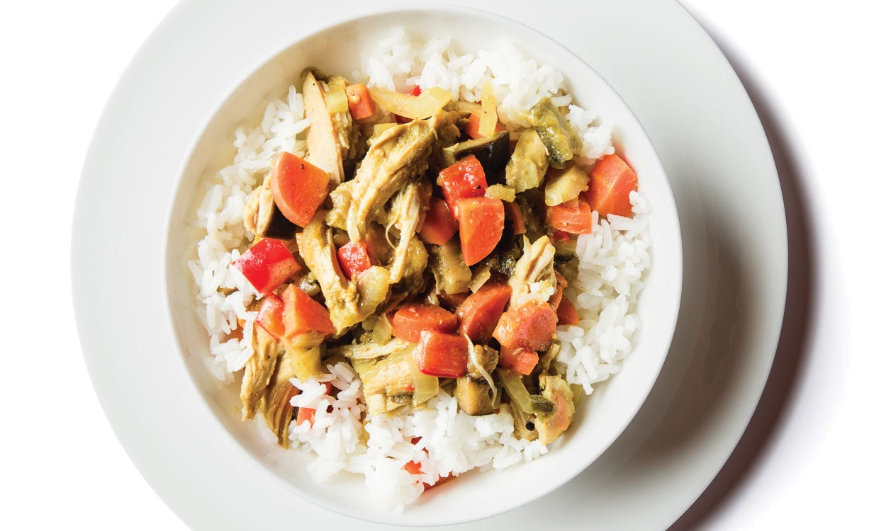 Heat olive oil over medium-high heat in a large pot or French/Dutch oven. Season chicken with salt and pepper and place in the pot. Sear 3–4 minutes per side, until browned. Add wine and 1/3 cup coconut milk, reduce heat to medium-low and cook for 30 minutes. In a bowl, toss the veggies with the canola oil, curry powder, agave or honey and add to the pot, stirring to combine. If all the coconut milk is absorbed, add another 1/3 cup. Cover and cook on medium heat for 30 minutes, stirring occasionally. Meanwhile, follow the package instructions to cook the rice. After 30 minutes, the chicken should be soft enough to break apart with a wooden spoon—shred into small pieces and stir to coat with all the curried veggies. Divide rice and curried chicken and veggies into four containers to store.