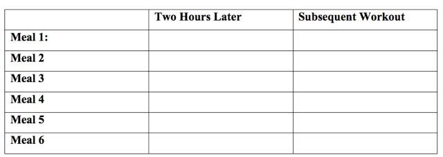If you eat fewer than six meals in a day, leave the irrelevant boxes blank and record your sleep quality in the box to the right of your last meal of the day. Likewise, leave all of the boxes blank in the “Subsequent Workout” column except the one that shares a row with the meal that preceded your daily workout.