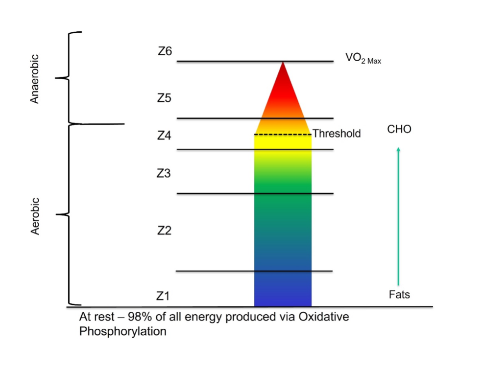 We ingest three macronutrients when we eat: CHO, fats, and proteins. Protein is not an energy source; however, CHO and fats are used to create energy. These two macronutrients are used to create a molecule called adenosine triphosphate (ATP). ATP is the “currency” for all processes in the body. For example, when a muscle contracts, it utilizes ATP. The human body produces ATP via aerobic (with oxygen) and anaerobic (without oxygen) pathways. The rate at which ATP is needed (i.e., the exercise intensity) determines the primary pathway for ATP production. For example, you will need ATP at a faster rate when performing a 400m sprint vs. running a 5K. Each of these events is performed at different exercise intensities.