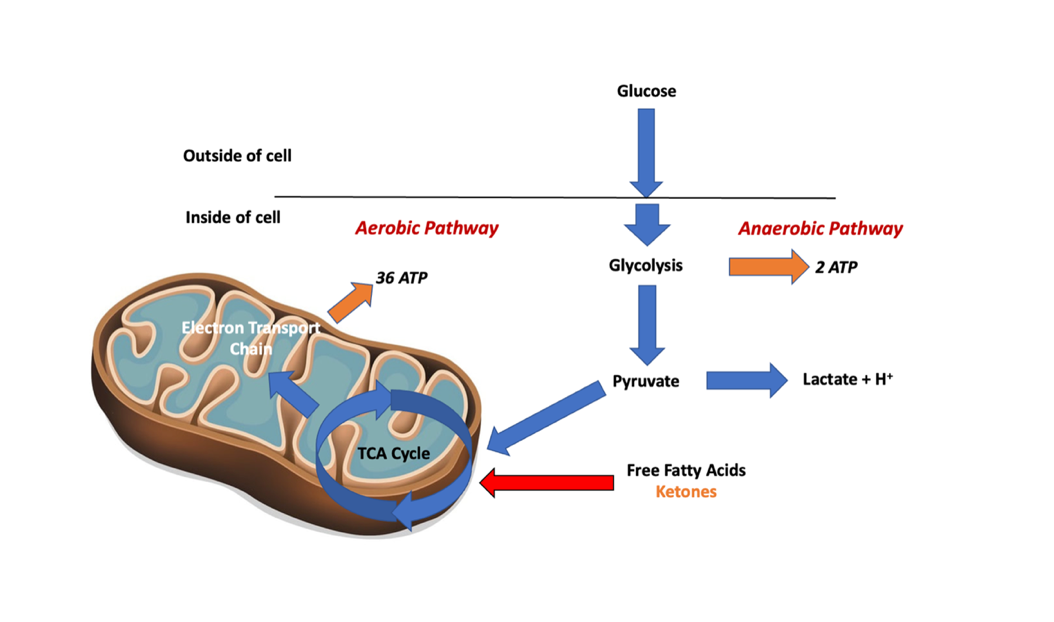 Exogenous and endogenous ketones are used to create ATP via the aerobic pathway. (Ketones are not a fuel source for ATP production via anaerobic pathways.) They enter the cell and the aerobic pathway at the point where the cycle is in the mitochondria. Once the ketones enter this cycle, the process for creating ATP is the same as if glucose was the fuel source. No matter the fuel source for the aerobic pathway, 36 ATP are produced versus the two ATP produced via anaerobic glycolysis. Based on this information, you might be asking yourself, “What is the benefit of taking exogenous ketones?” Well, we’ll get to that next.