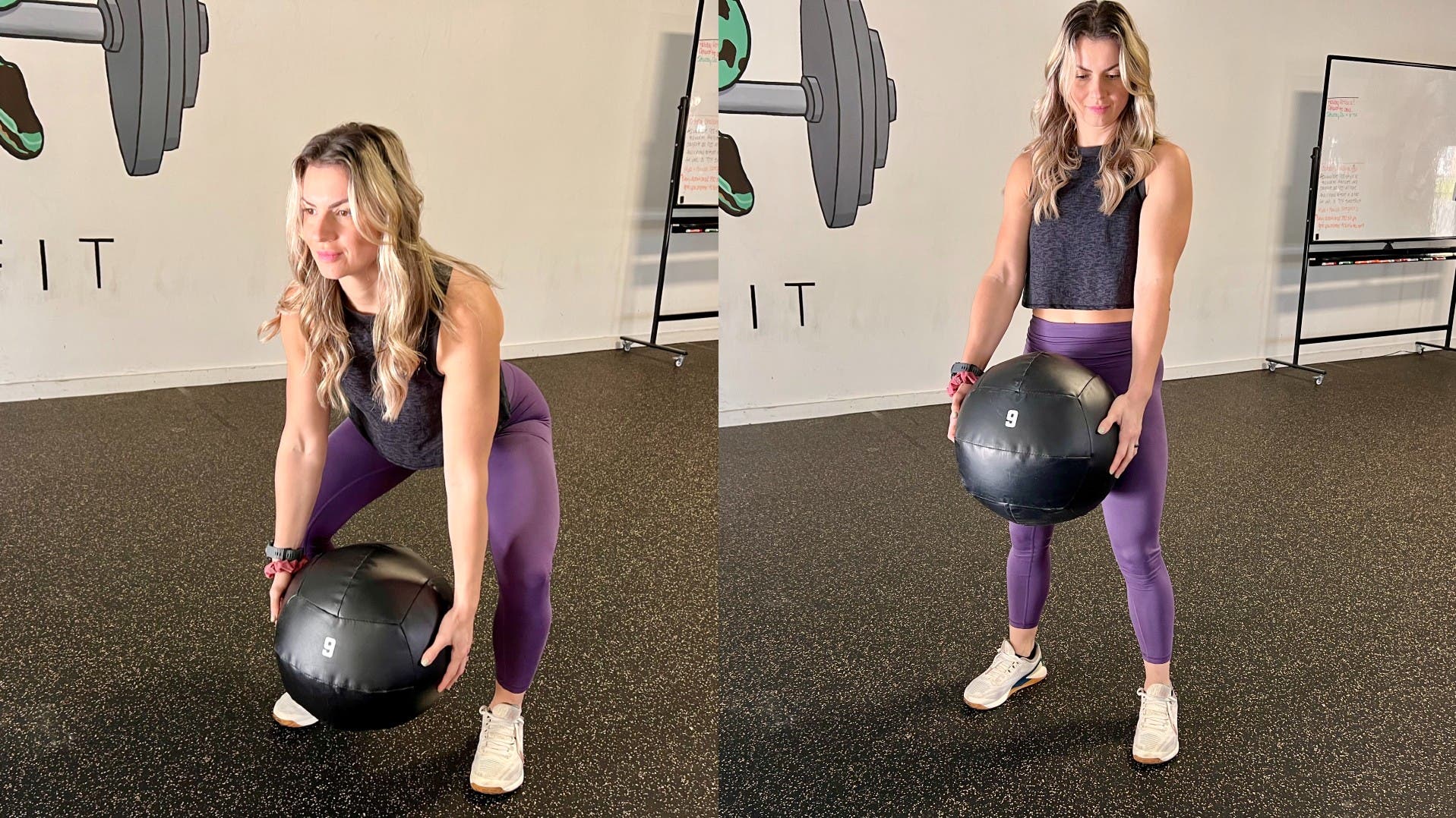 Place the ball directly between your feet and lower your butt and hips back while keeping your chest upright. Grip the medicine ball and stand up, bringing the med ball from the floor to in front of your hips. Your arms will act as straps, staying straight the entire time as you return the ball to the ground.