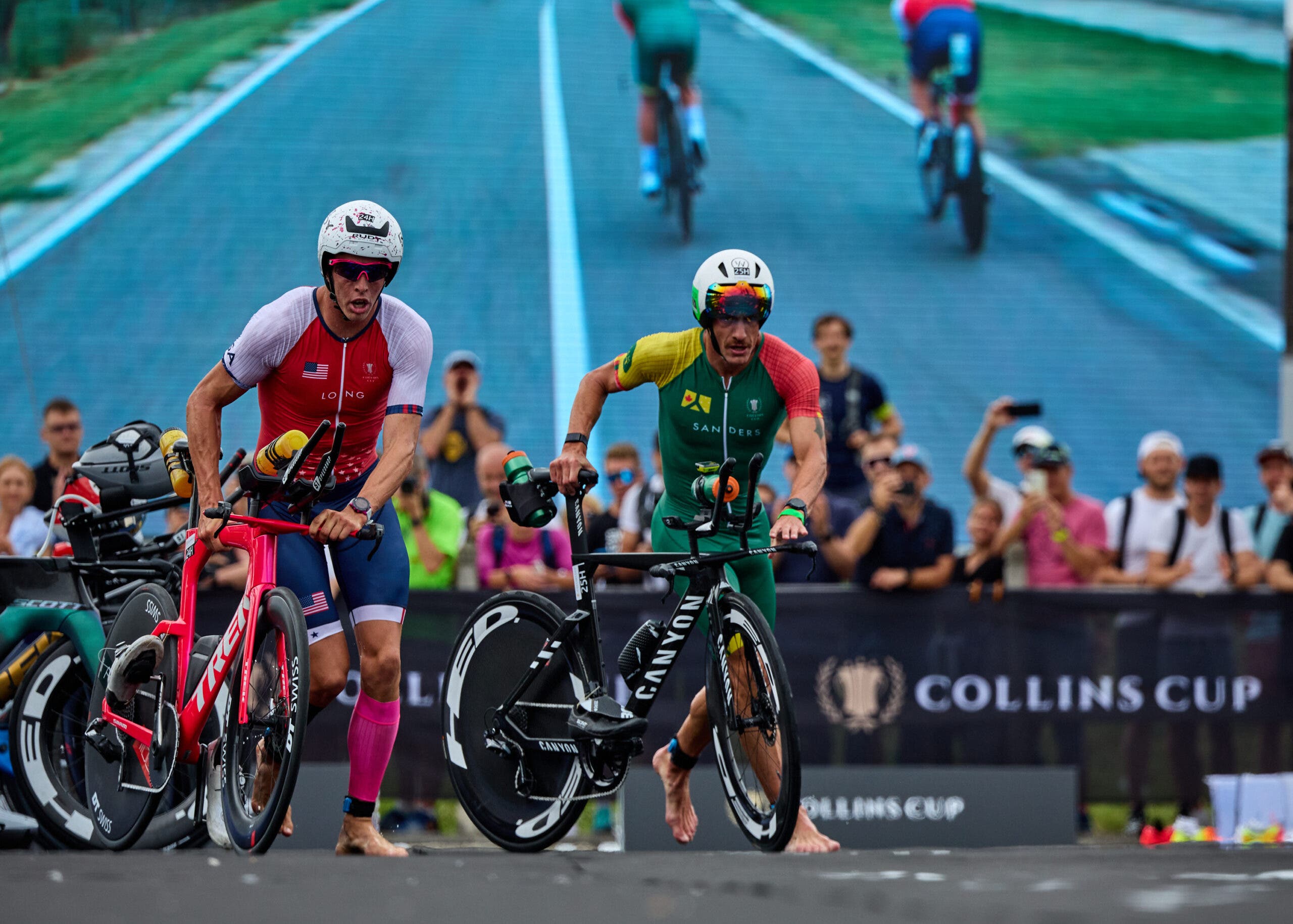 On August 20, 36 of the world’s top long-course triathletes in the world converged on Bratislava, Slovakia, for the Collins Cup. Matched up in groups of three, based on national affiliation, triathletes went head-to-head-to-head to earn points for their team. One of the most anticipated matchups of the day also proved to be the most exciting, by far—the matchup of Sam Laidlow, Sam Long, and Lionel Sanders.