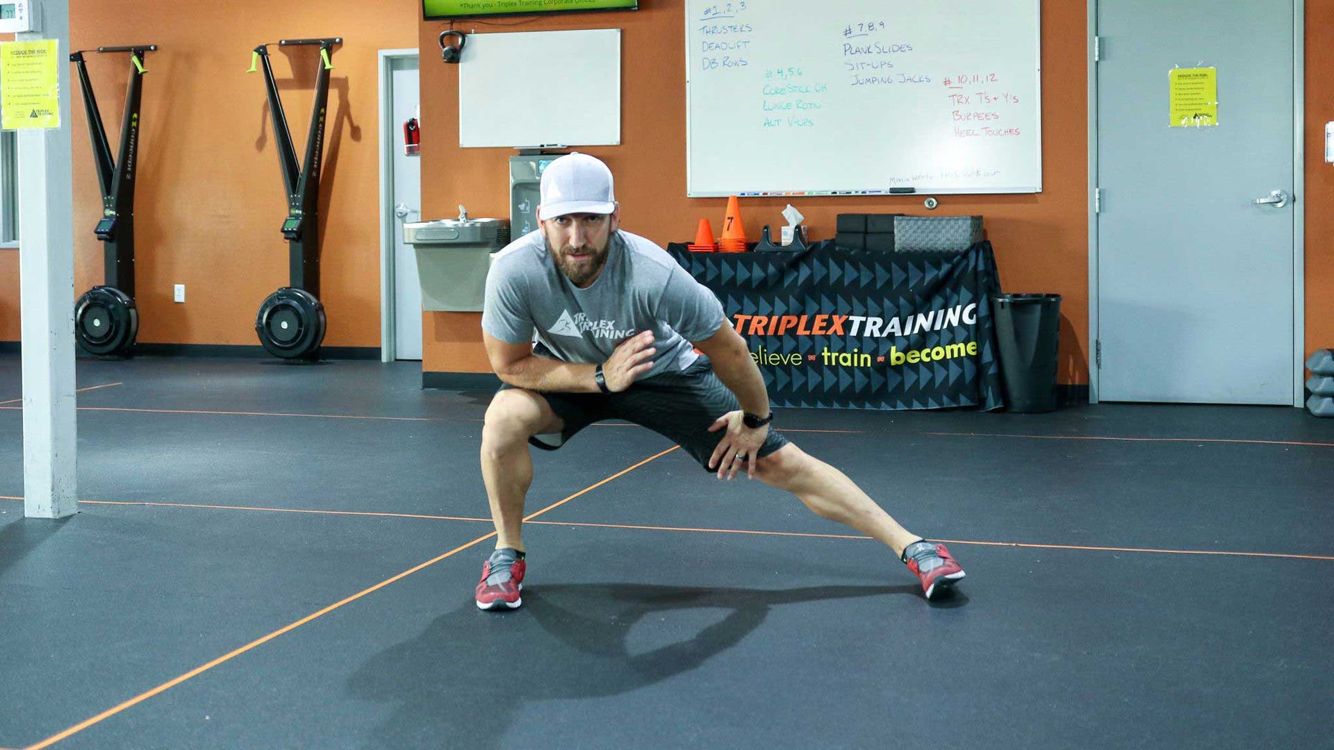 With legs in a wide stance position, shift your body weight from left to right while keeping your hips low. This will stretch the adductor on the opposing leg while improving hip mobility on the working side.