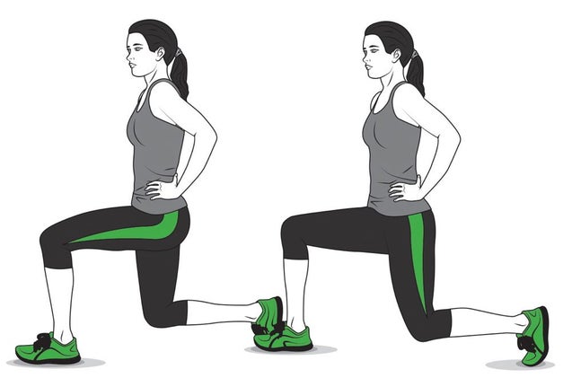 Standing straight with your feet together, step forward with your right leg and lower your body downward. Be sure to keep your right knee in alignment with your ankle, not over your toes. Come down to a 90-degree angle, rise back up, and lunge with the left leg. 10–20 reps each leg