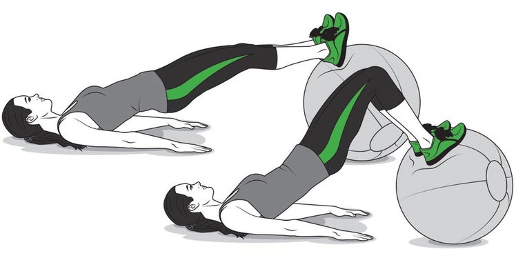 Lie on your back with a stability ball under your heels and your legs straight. Carefully raise your hips off the ground with your shoulders, stabilizing your body until you are in a straight plank. Bend your knees and slowly roll the ball toward your body, pause, and roll the ball back out to its original position. 10–20 reps