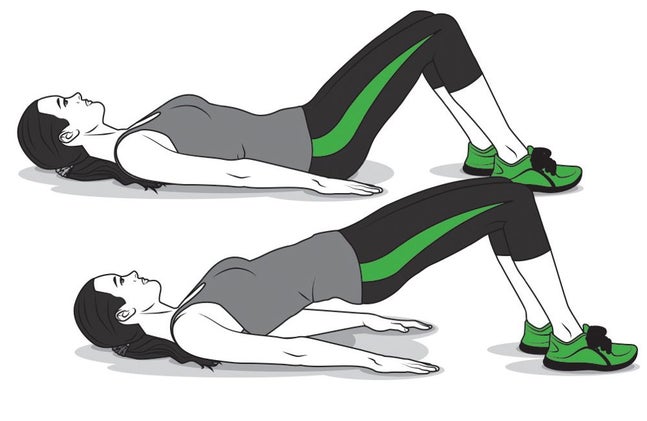 Lie on your back with your knees bent, feet flat on the floor, and arms at your sides. Engage your hamstrings and lift your backside off the floor until your knees, hips and shoulders are aligned. Hold for two seconds and lower back down. 10–20 reps