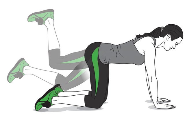 On all fours, kick your right leg back and upward in a deliberate, smooth motion. Bring the leg back to the original position and kick up again. 15 reps each side