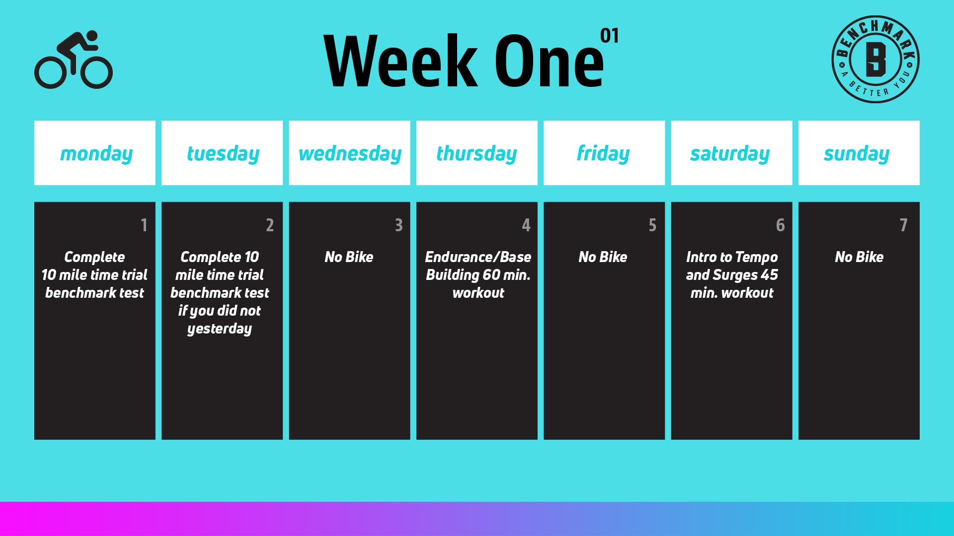 (Of course, for those of you who’ve recently completed the final 5K run test, give yourself a few recovery days before getting started on bike month! You want to approach the initial 10-mile time trial test feeling mentally and physically ready to crush it.)