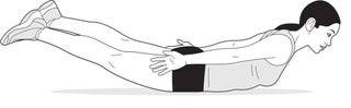 Lie facedown on the floor with your legs straight and your arms next to your sides, palms down. Contract your glutes and the muscles of your lower back, and raise your head, chest, arms and legs off the floor. Simultaneously rotate your arms so that your thumbs point toward the ceiling. At this time, your hips should be the only parts of your body touching the floor. Hold this position for the prescribed time. (Note: If you can’t hold it for the entire time, hold for 5 to 10 seconds, rest for 5, and repeat as many times as needed. If the exercise is too easy, you can hold light dumbbells in your hands while you do it.)