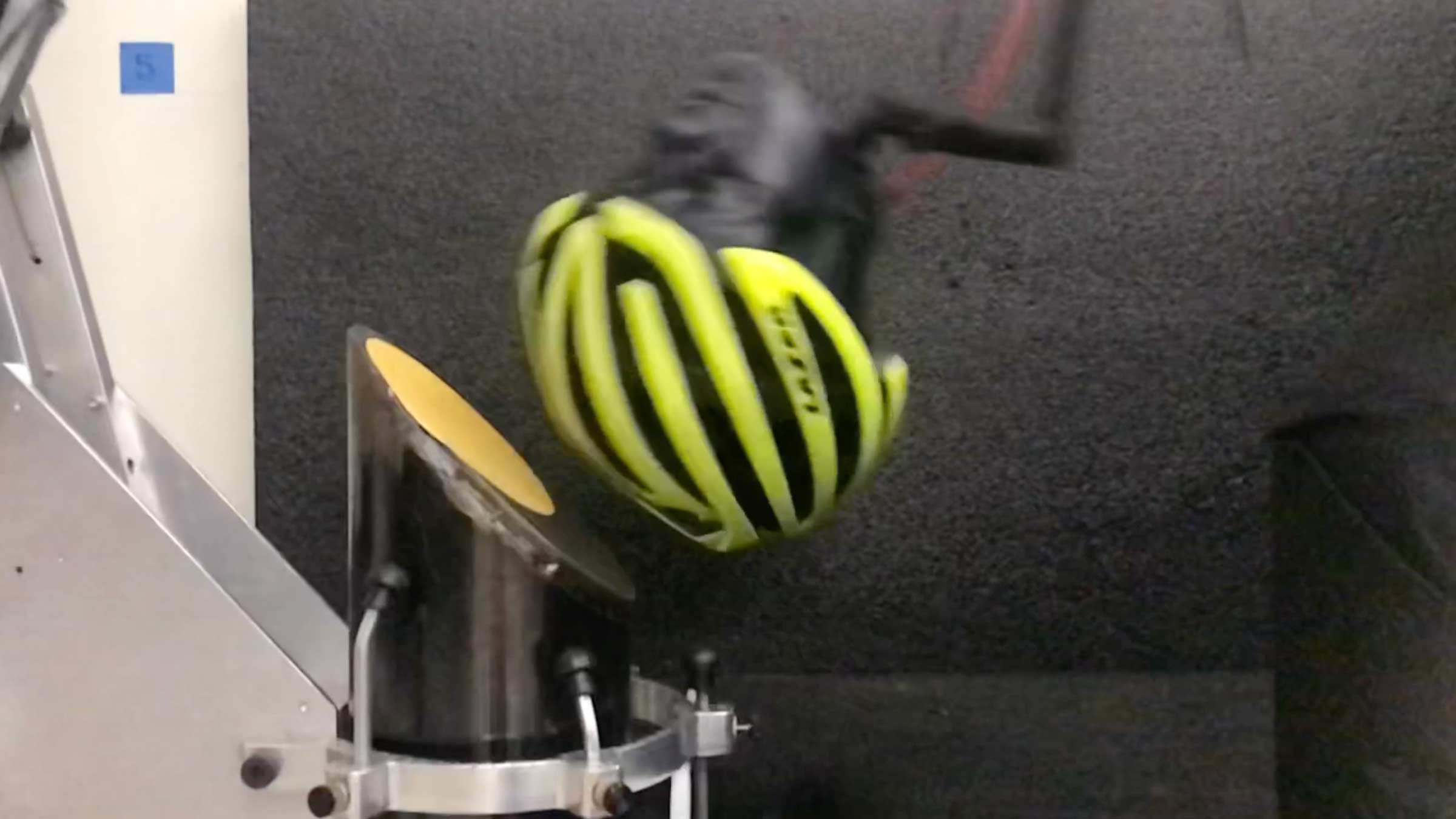 Virginia Tech’s STAR bicycle-helmet impact-test methodology involves dropping a NOCSAE instrumented headform encased in a helmet onto a steel, 45-degree-angled plane covered with 80-grit sandpaper (replaced after every fourth test). This evaluates a helmet’s ability to reduce not only linear acceleration but also rotational velocity of the head resulting from a bike crash.