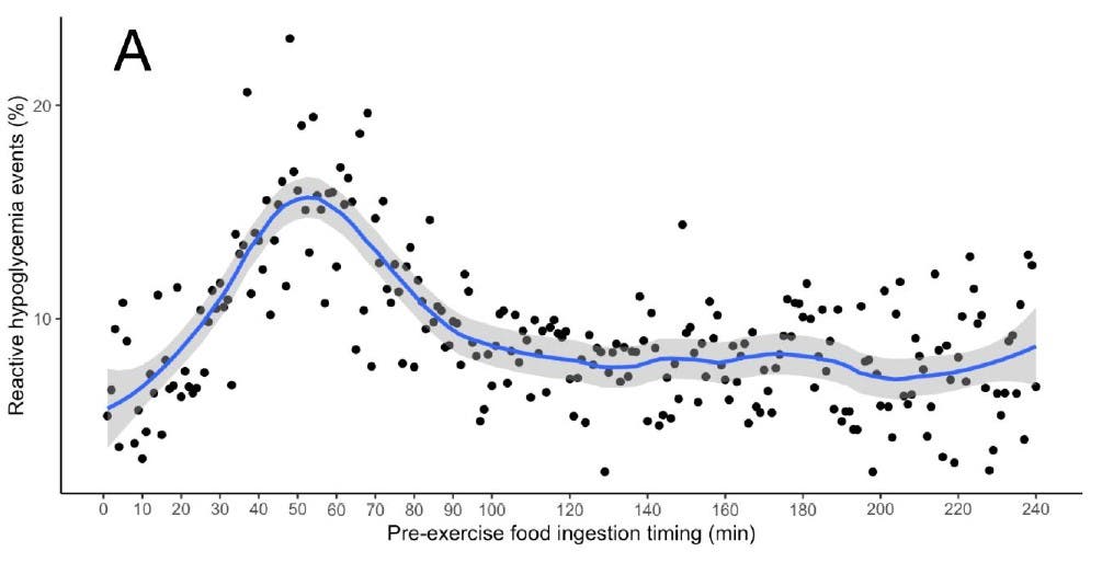 The study itself is fairly straightforward. They analyzed almost 49,000 events from 6,700 users in which someone ate something and then exercised. The key variables were how long before exercise they ate, and whether their glucose levels dipped below 70 mg/dL during the first 30 minutes of exercise. This is an arbitrary threshold for rebound hypoglycemia, and in fact there doesn’t seem to be a consistent threshold that produces negative symptoms in different people. Scientists aren’t even sure whether it’s the absolute level of glucose that matters, or the rate at which it’s dropping, or some other combination. But 70 mg/dL is a reasonable benchmark that indicates that your blood sugar levels dropped significantly more than you’d expect.