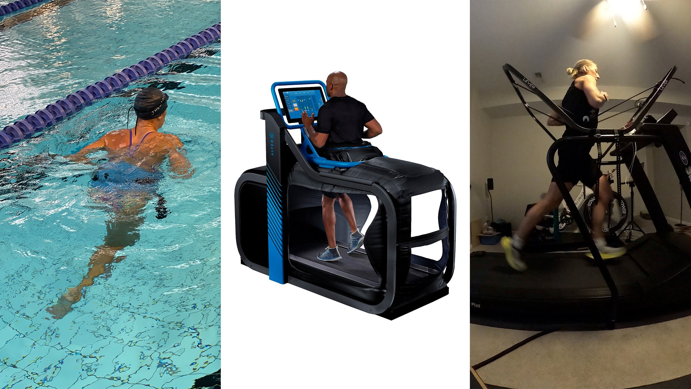 In general, the run-like alternative options for injured athletes are: pool or water running, running on an Alter G, or the new Lever running system that attaches to a treadmill. All three are valuable and could, in fact, all be used to complement each other. But what are the benefits of each? Is one better than the other? Don’t panic just because you’re injured; we’ve broken it down for you.