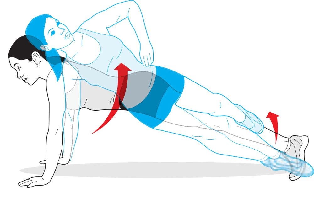 Start by performing a side plank with your right side down. Hold for 1 or 2 seconds, then roll your body over onto both elbows—into a traditional plank—and hold for 1 or 2 seconds. Next, roll all the way up onto your left elbow so that you’re performing a side plank facing the opposite direction. Hold for another second or two. That’s 1 repetition. For an added challenge, try it on your hands, starting from a high push-up position. Make sure to move your whole body as a single unit each time you roll.