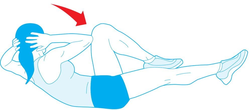 Lie faceup with your hips and knees bent 90 degrees so that your lower legs are parallel to the floor. Place your fingers on the sides of your head. Lift your shoulders off the floor as if doing a crunch. Twist your upper body to the left while bringing up your left knee to touch your right wrist. Simultaneously straighten your right leg. Return to the starting position and repeat to the other side.