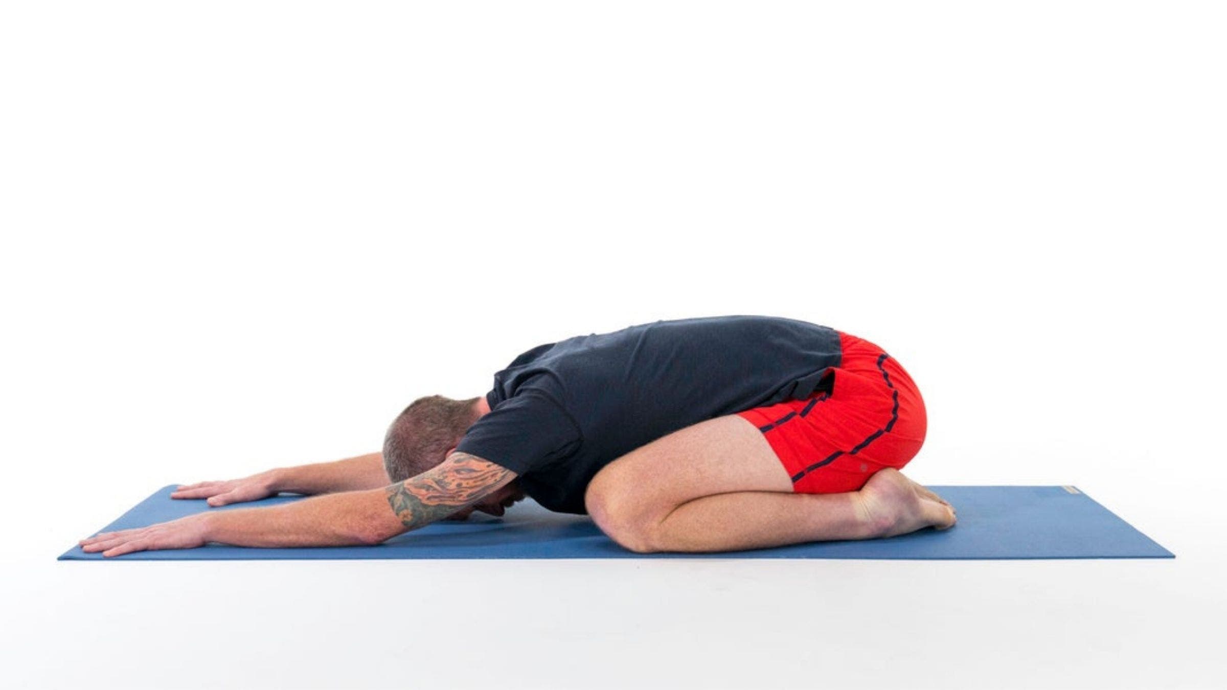 Do the move: Start from a kneeling position. Bring your big toes to touch and bring your knees to the edges of your yoga mat. Place a folded blanket or pillow under your stomach and between your legs, then fold forward to rest your body and head on the blanket, turning your head to one side. In traditional Child’s Pose, you’ll increase flexion of your spine by keeping your knees close together and just draping your belly down over your thighs, resting your forehead on the mat and stretching your arms toward the front of your mat.