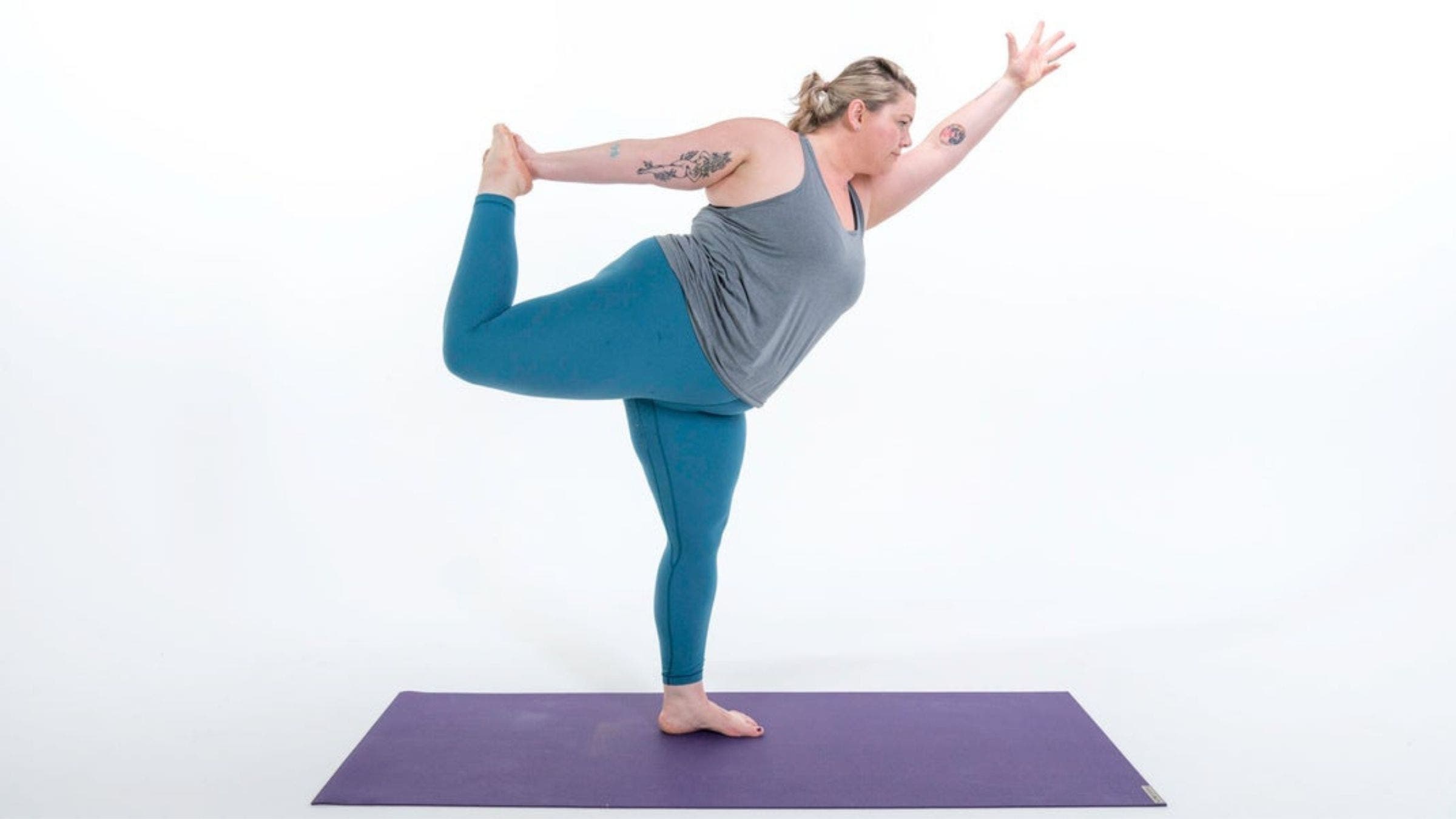 How it helps: This yoga variation on the gym class quad stretch is helpful in building flexibility in the bent leg and strength and stability in the standing leg, including the quads, calves and hamstrings.