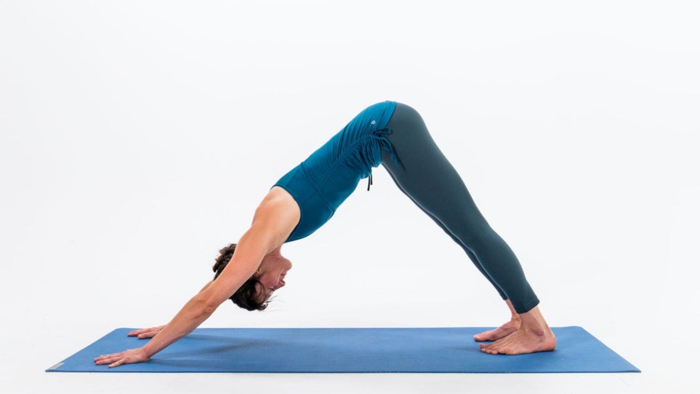 Do the move: Starting from your hands and knees with palms spread and toes curled under, lift your knees, hips, and sitting bones toward the ceiling. Keep your spine long, and stretch your heels toward the floor without locking your knees.