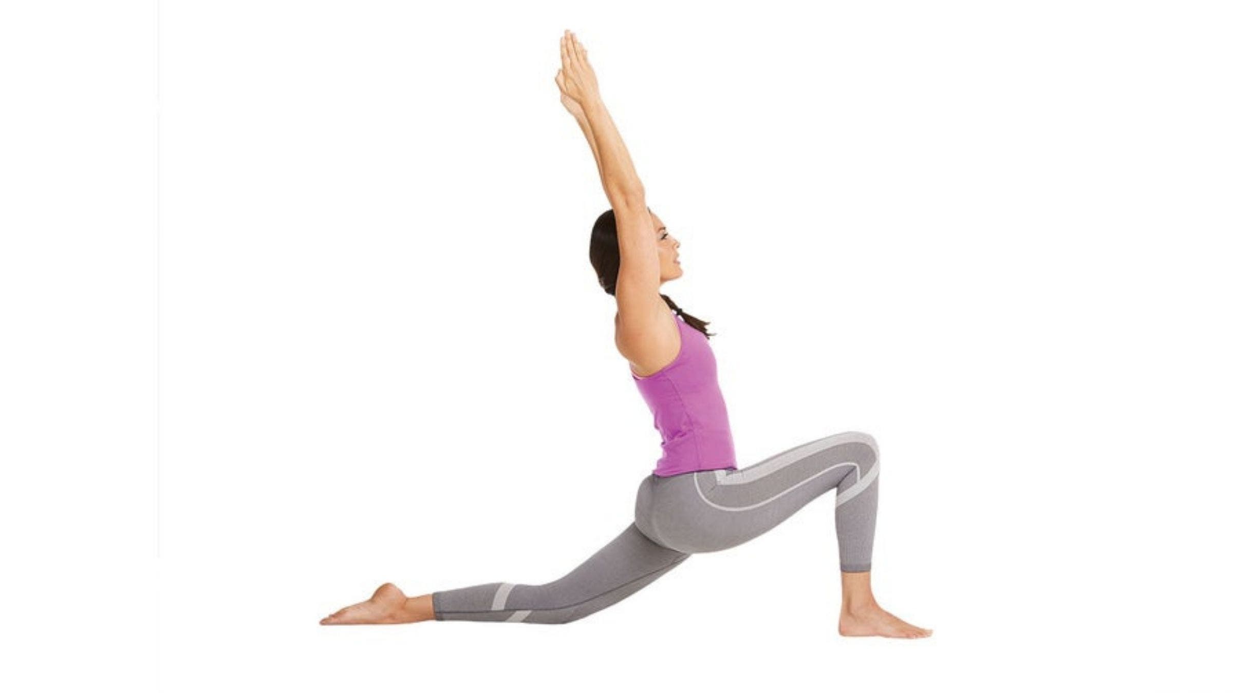 Do the move: Starting from your hands and knees, sweep your right foot forward underneath you, and position your foot between your hands. Stack your right knee above your ankle, and scoot your left knee backward until you feel the stretch. When you’re ready, lift up your chest, tuck your tailbone, and raise your arms overhead. Repeat on the other side. Rountree also likes a variation of this pose, Proposal Pose, in which you keep both knees at 90-degree angles and you include a slight backward tilt in the pelvis. Bonus: It can also stretch hip flexors.
