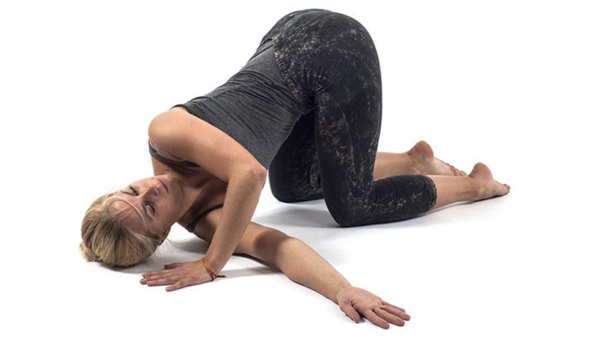Do the move: Start from a neutral tabletop position, with hips stacked over knees, shoulders stacked over wrists, neutral spine, and fingers pointing forward. Slide your right arm underneath your left arm with your palm up, then slowly lower your right shoulder, right ear, and cheek to rest on the mat. Keep your left elbow and hips raised. Unwind, return to Table, then repeat on the other side. To increase the intensity of the twist, you can rest the back of your non-threading hand on your lower back once you’re in the position.