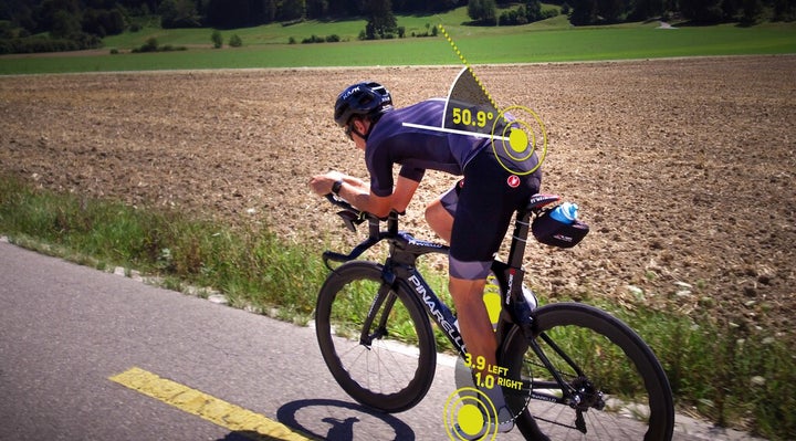 On his post-IM Zurich ride, Wurf was sporting a LEOMO Type-R motion capture system. “We put motion sensors on his feet, legs, and sacrum, which allowed us to look at this foot, leg, and hip motion in real time,” says Sebastian Weber, a pro swim and bike coach who has worked with many top pro cycling athletes.