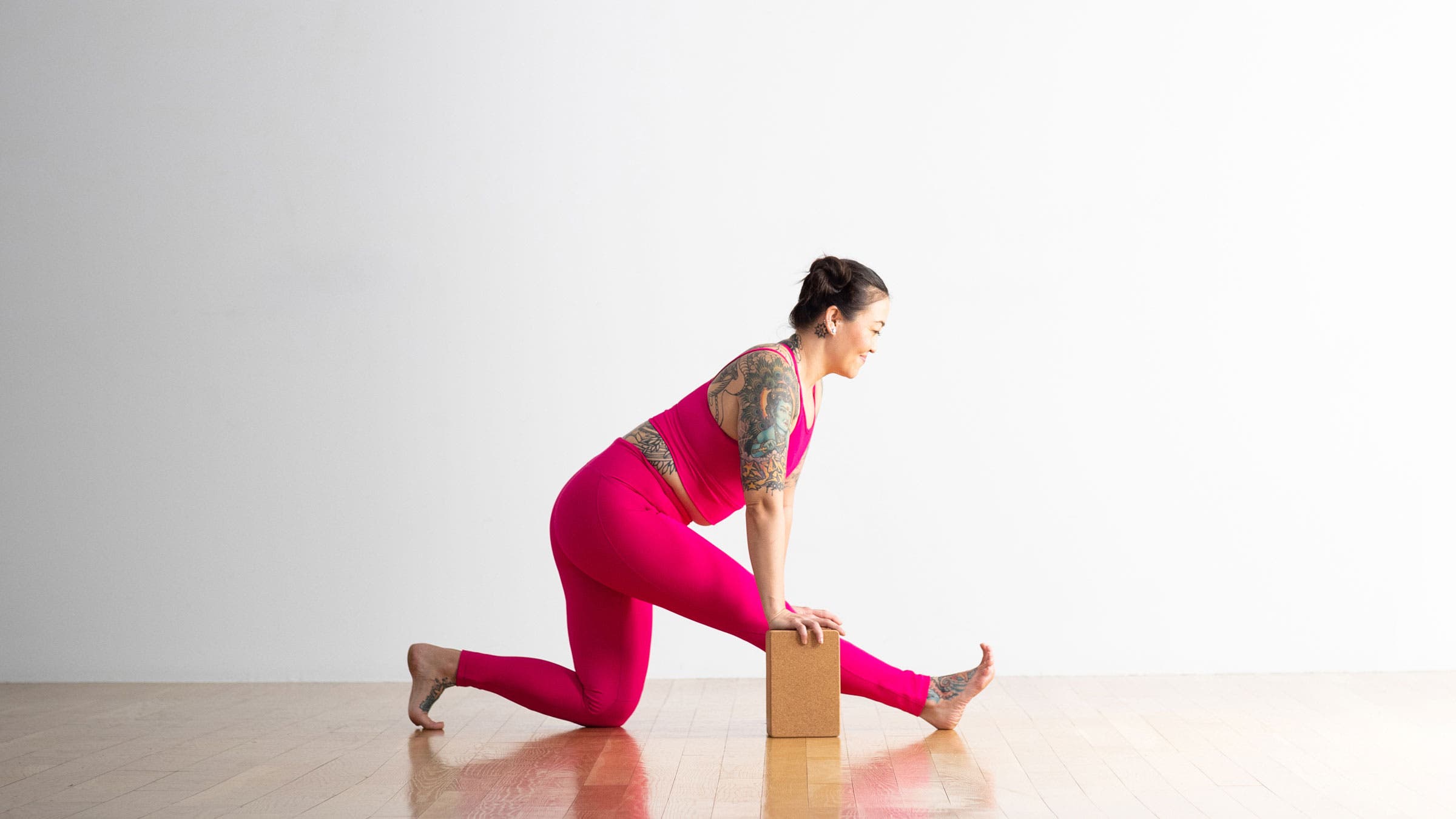 How to: Start in Adho-Mukha Svanasana (Downward-Facing Dog Pose). Step your right foot in between your hands and lower your back knee to the mat or a folded blanket. Lift your torso until your shoulders stack over your hips or place your hands on blocks alongside your front foot in Low Lunge. Stay here and breathe. Repeat on the other side.