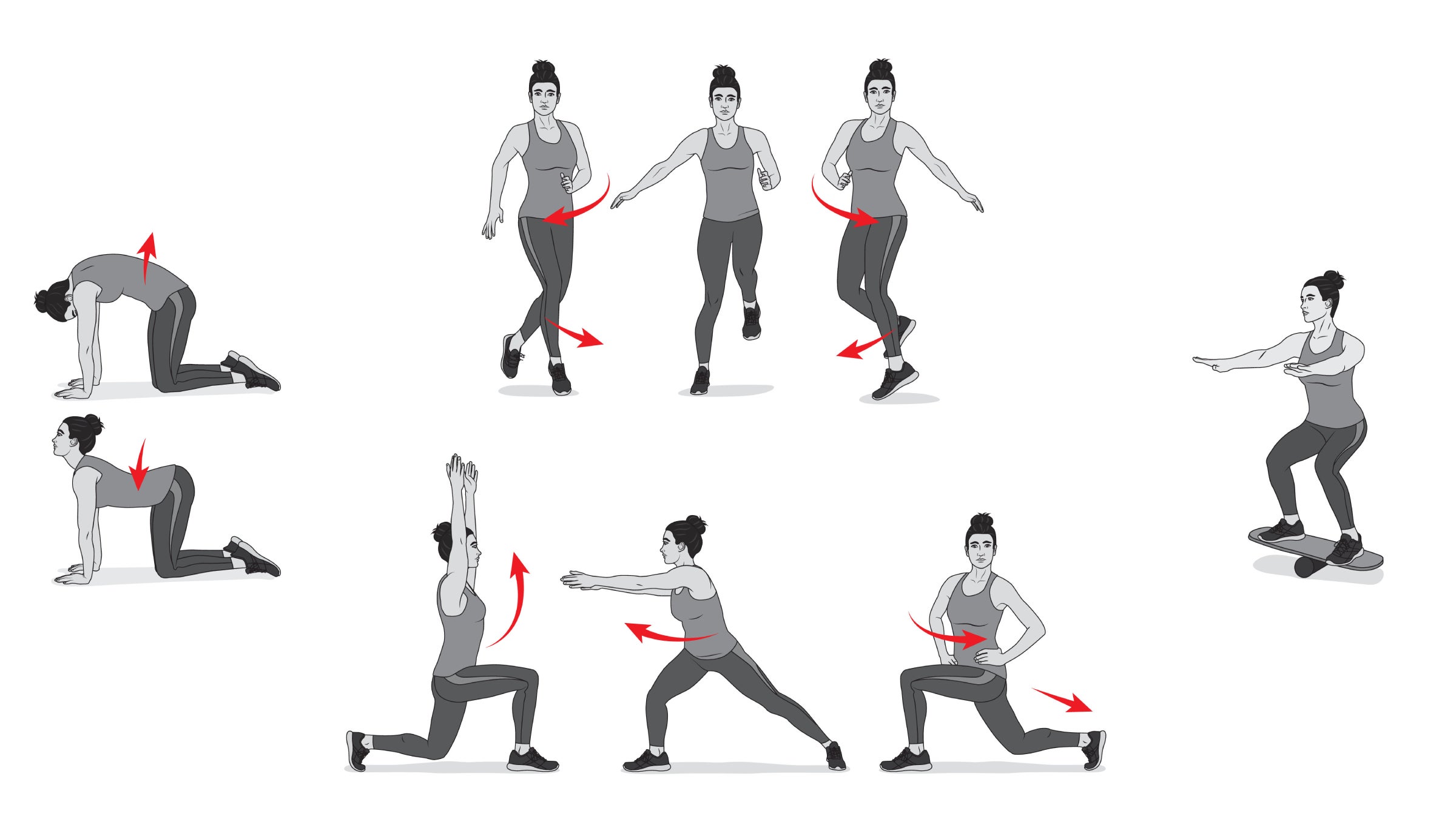 Do two to three sets of 10-15 reps of each variation. Remember that you can vary the intensity by how far you step and how deep you lunge.