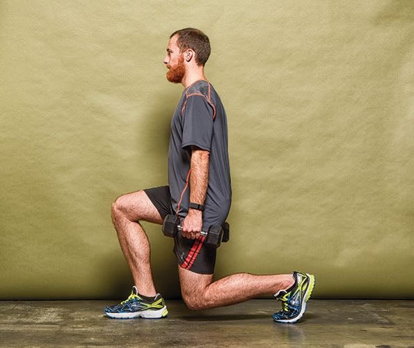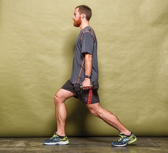 “Weighted lunges will improve the use of fast-twitch muscle fibers—muscle fibers that don’t normally get recruited when running slowly,” says Jon-Erik Kawamoto, a Canadian strength-training coach. He suggests runners do lunges one to two times per week. “In the off-season, I recommend 8 to 12 reps per leg, and in season, I recommend 4 to 6 reps per leg,” he says.