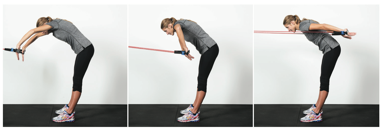 Position yourself just like the scull drill. With a light pressure on the stretch cords and while maintaining a high-elbow position, pull your hands and forearms down and back until they are directly underneath your elbows. Slowly release to the starting position for an eccentric exercise.