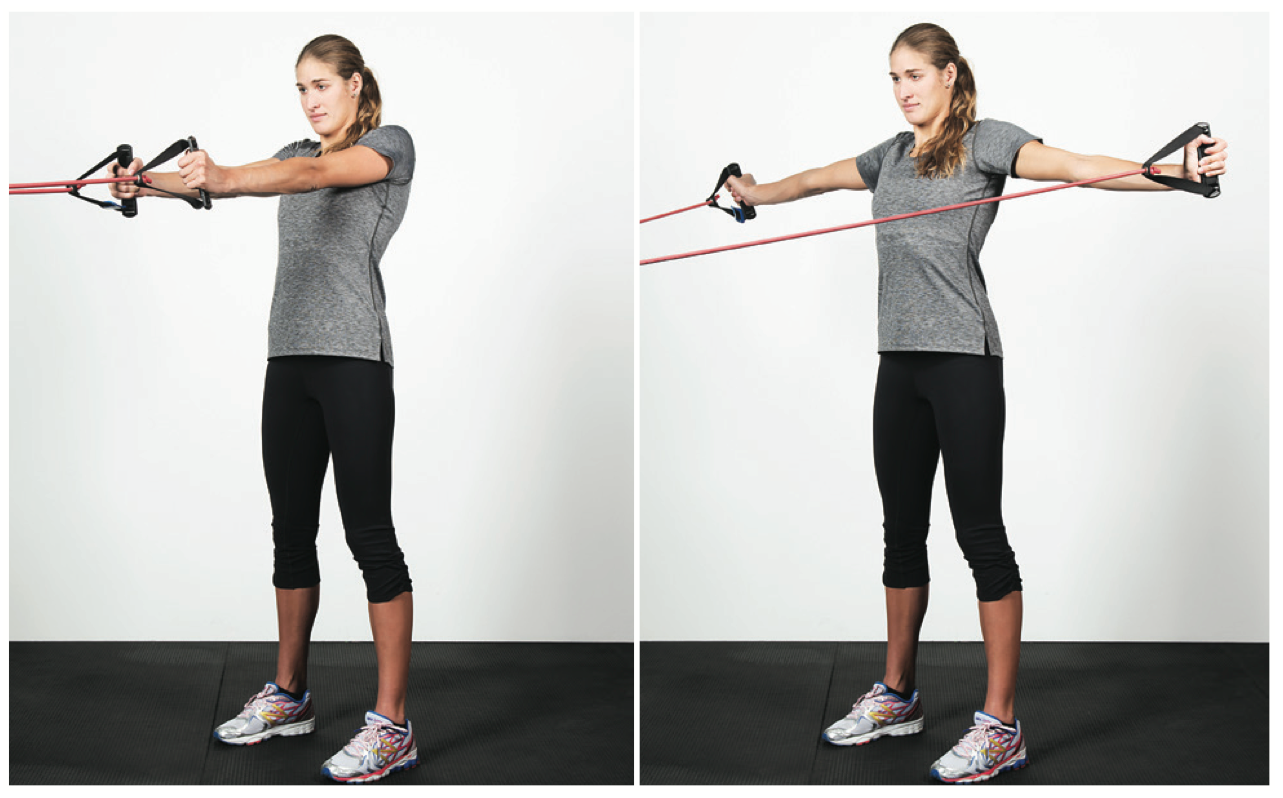 Face away from the attachment and stand tall. Raise arms into a “T” position at chest height. With a slight bend in the elbow, pull arms together to meet in the front. Control the speed of the release of the stretch cords for an additional eccentric exercise.
