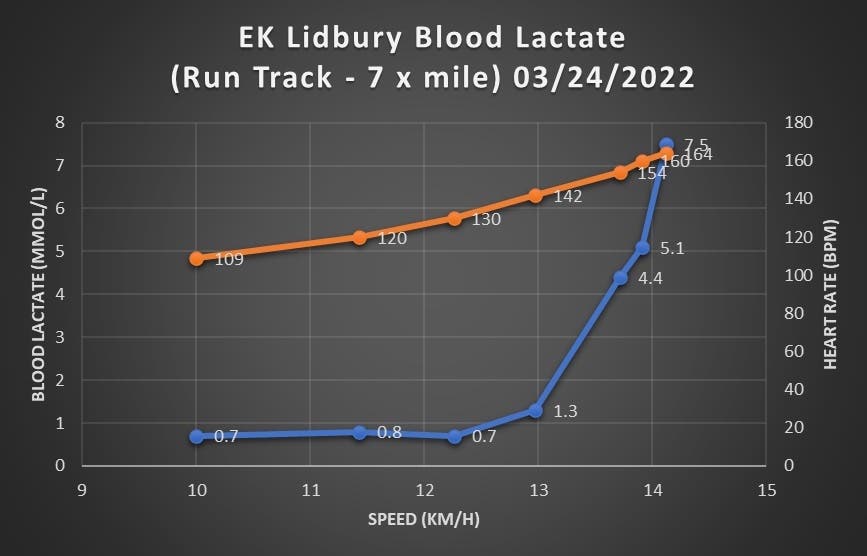 You came into the test with lactate at 1.6 mmol/L, it was 1.0 mmol/L after your first 800m walk, and then you can see it continued to drop further for the initial stages down to a low of 0.7 mmol/L. This is desirable and indicates very high mitochondrial efficiency and a strong aerobic base. The Norwegians are famous for doing their easy miles below 1.0 mmol/L. For most athletes, this is prohibitive (they just can’t get that low), but for you, when jogging at ~120 bpm, your lactate is likely under this magic 1.0 mmol/L mark.
