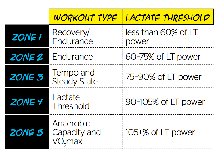 Since power at LT is one of the most important determinants of cycling performance, it makes sense to organize the training-intensity zones based on a percentage of LT. You can get a good sense of your LT with a maximal, even-paced 25-mile time trial on the bike. Your lactate threshold will correspond with your average power output. Alternatively, you can determine LT by performing a 20-minute time trial and then taking 95 percent of your average power output as your LT. For example, if your average power during the 20-minute time trial was 200 watts, then your lactate threshold is 190 watts.