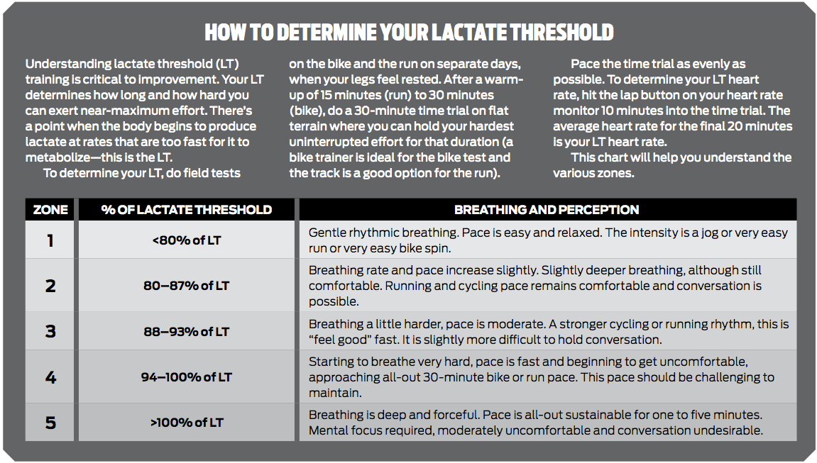 Lactate threshold: Slightly faster than Olympic-distance race pace. Performed at your best average 30-minute run or best average 45-minute bike pace.