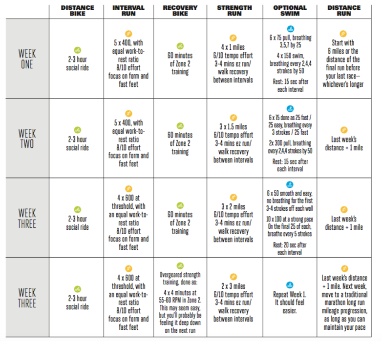 Two bike workouts. During the first three weeks, keep them social and recovery–oriented. These help maintain your aerobic base and help your body process the new and challenging run program.