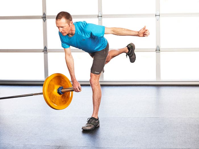 Hinge your hips back while keeping your spine completely straight, and lower the bar while raising your back leg behind you.