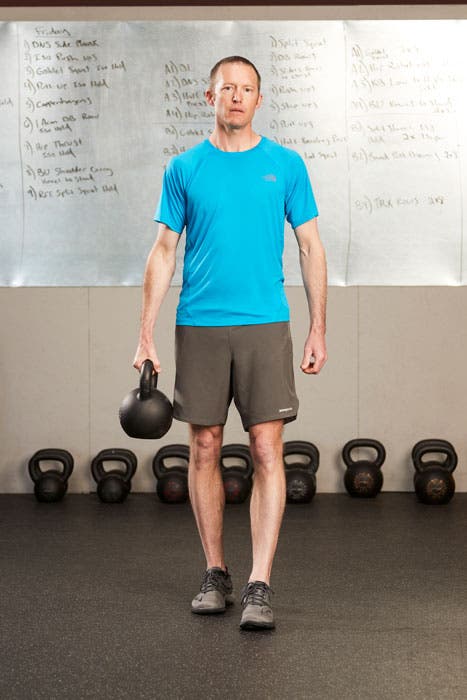 Hold a kettlebell tight to your chest in both hands with shoulder blades spread wide and locked down on the back—feet shoulder-width apart.