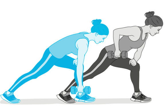 From a lunge, rest the arm of your forward leg on your thigh. Place the weight by your forward foot, square your shoulders to the ground, and pull with your back muscles. Pull straight up and lower straight down, don’t open your shoulder at the top of the row.
